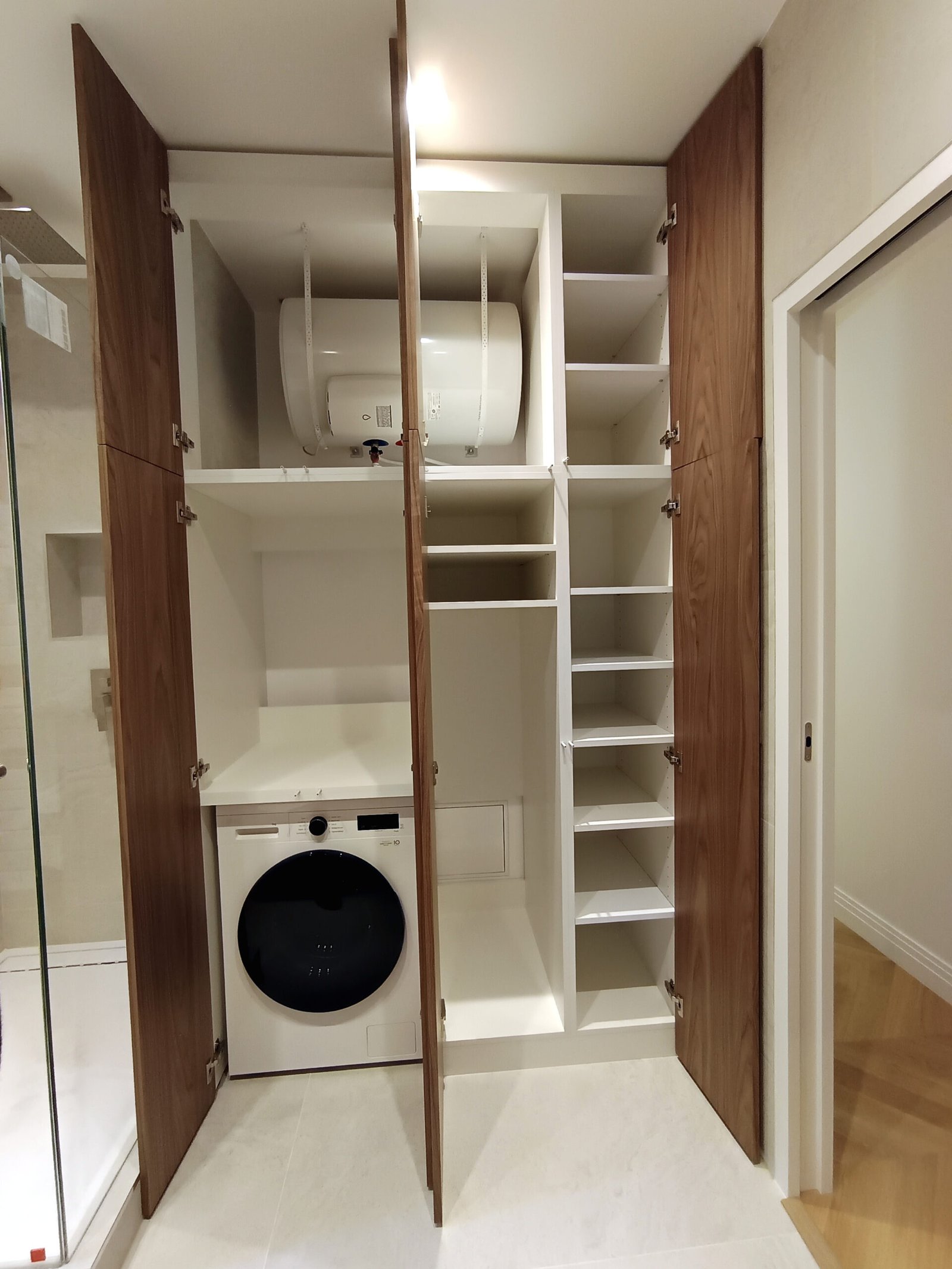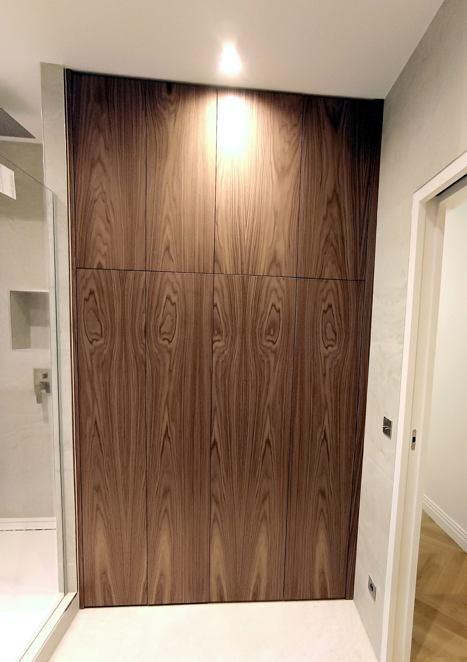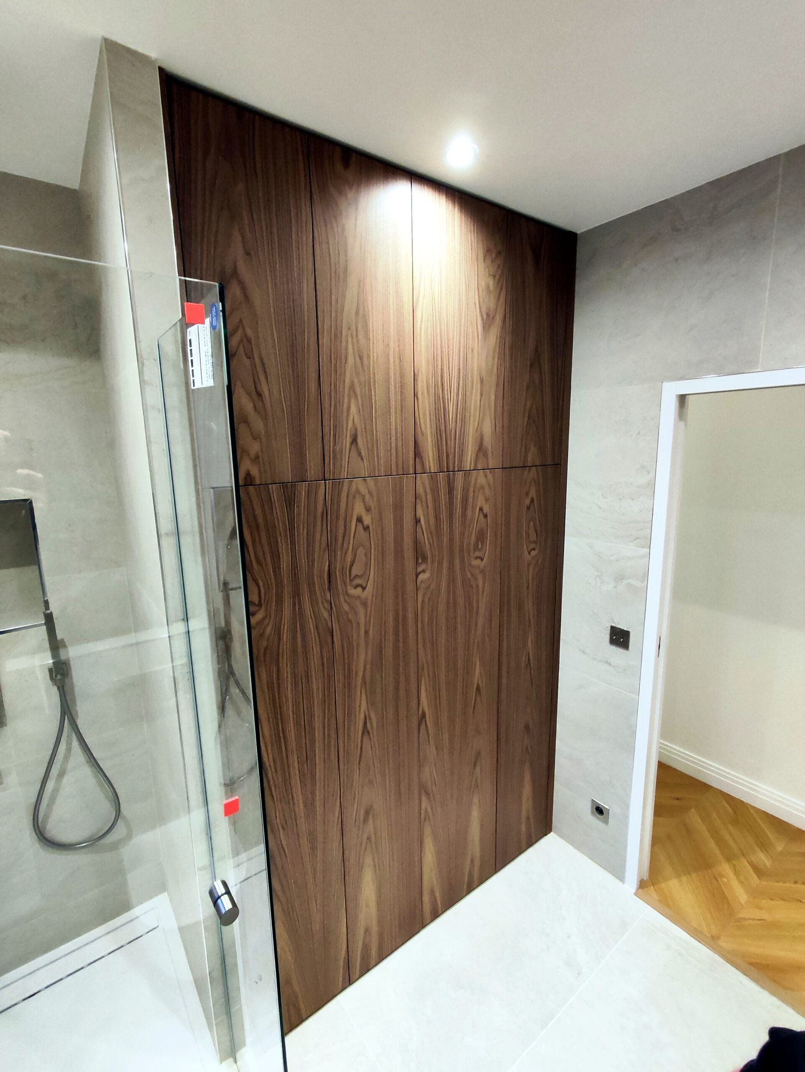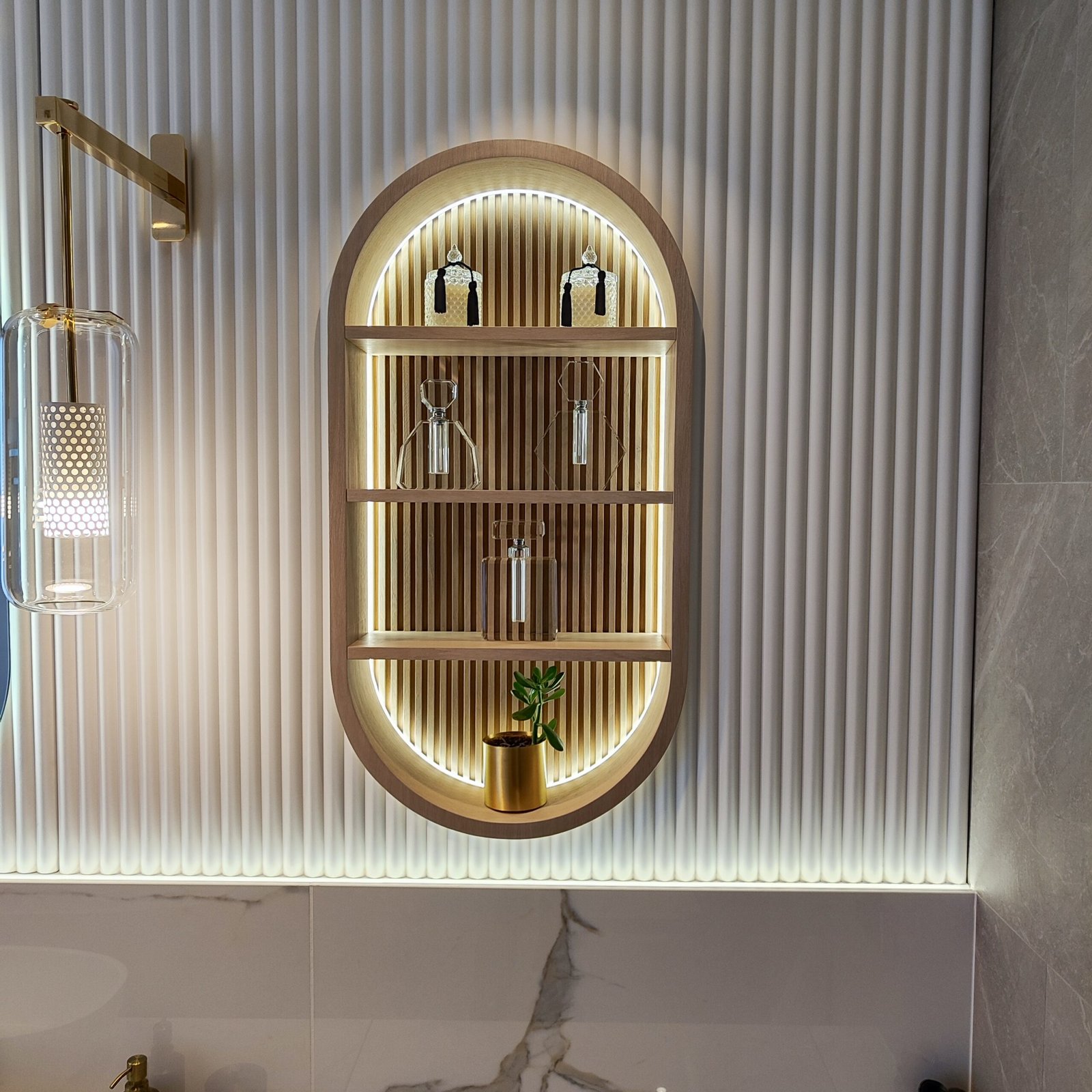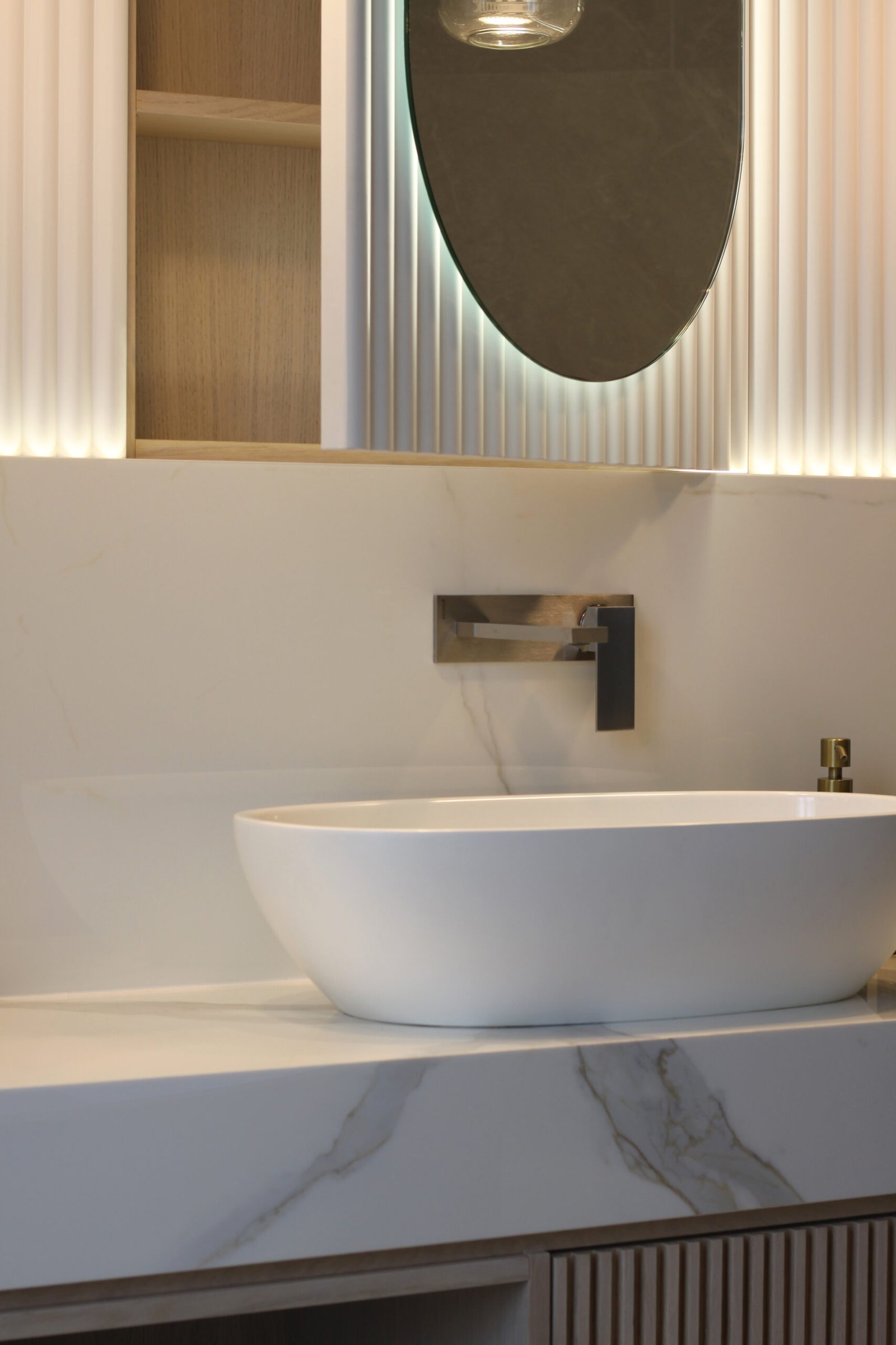 Salle de bain élégante au design sophistiqué, mêlant marbre, panneaux cannelés, bois et laiton.