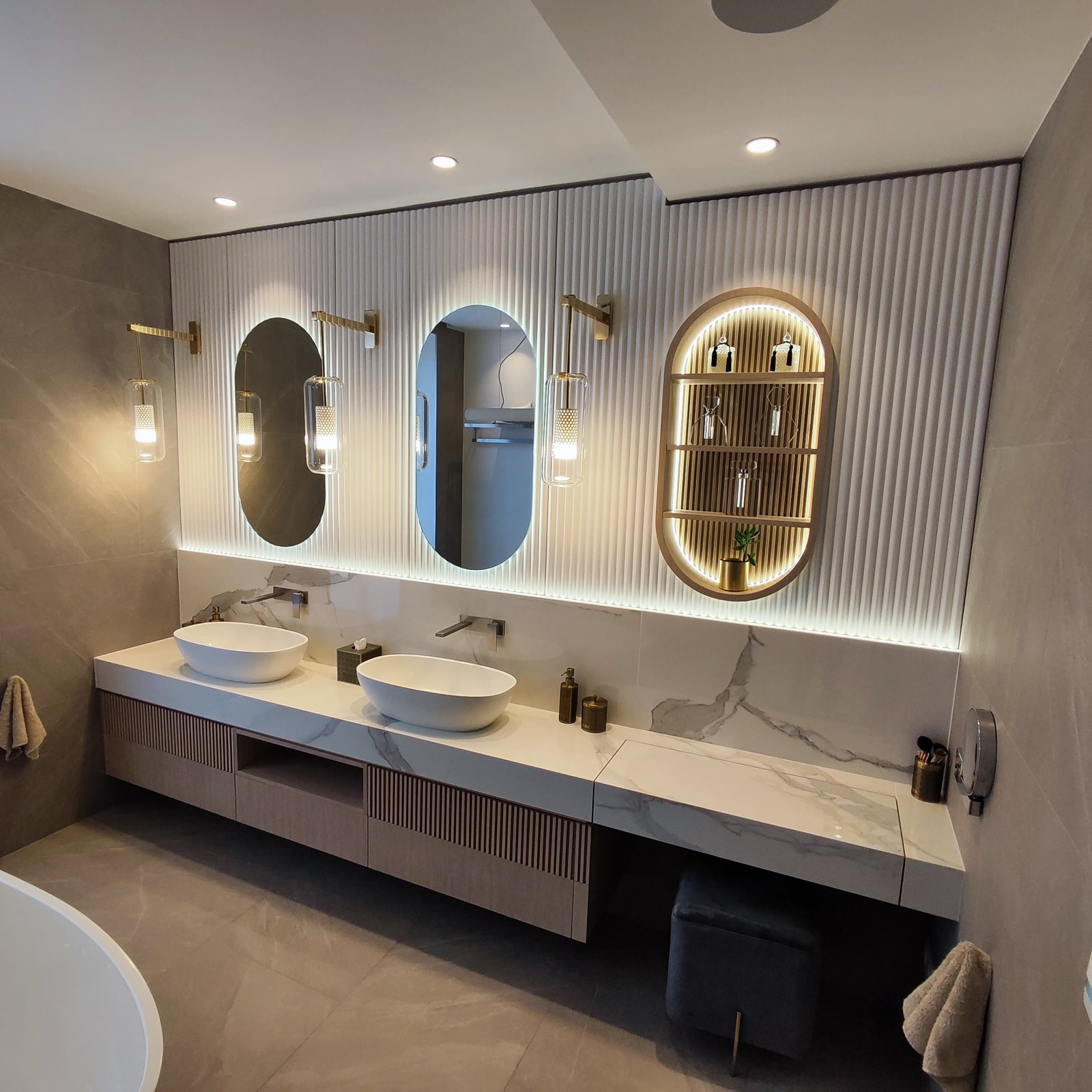 Meuble vasque flottant, miroirs ovales rétroéclairés, coiffeuse avec miroir rabattable