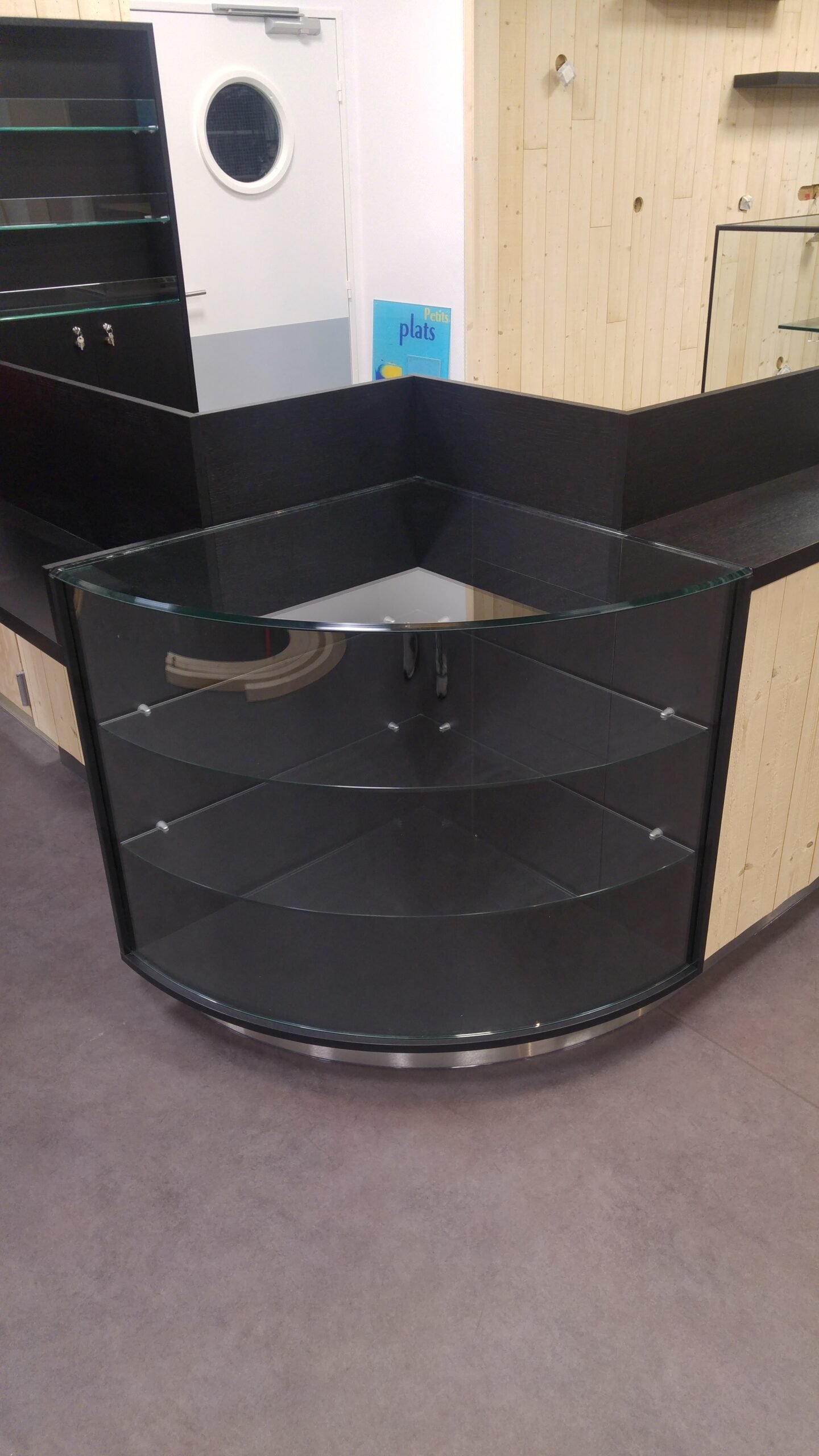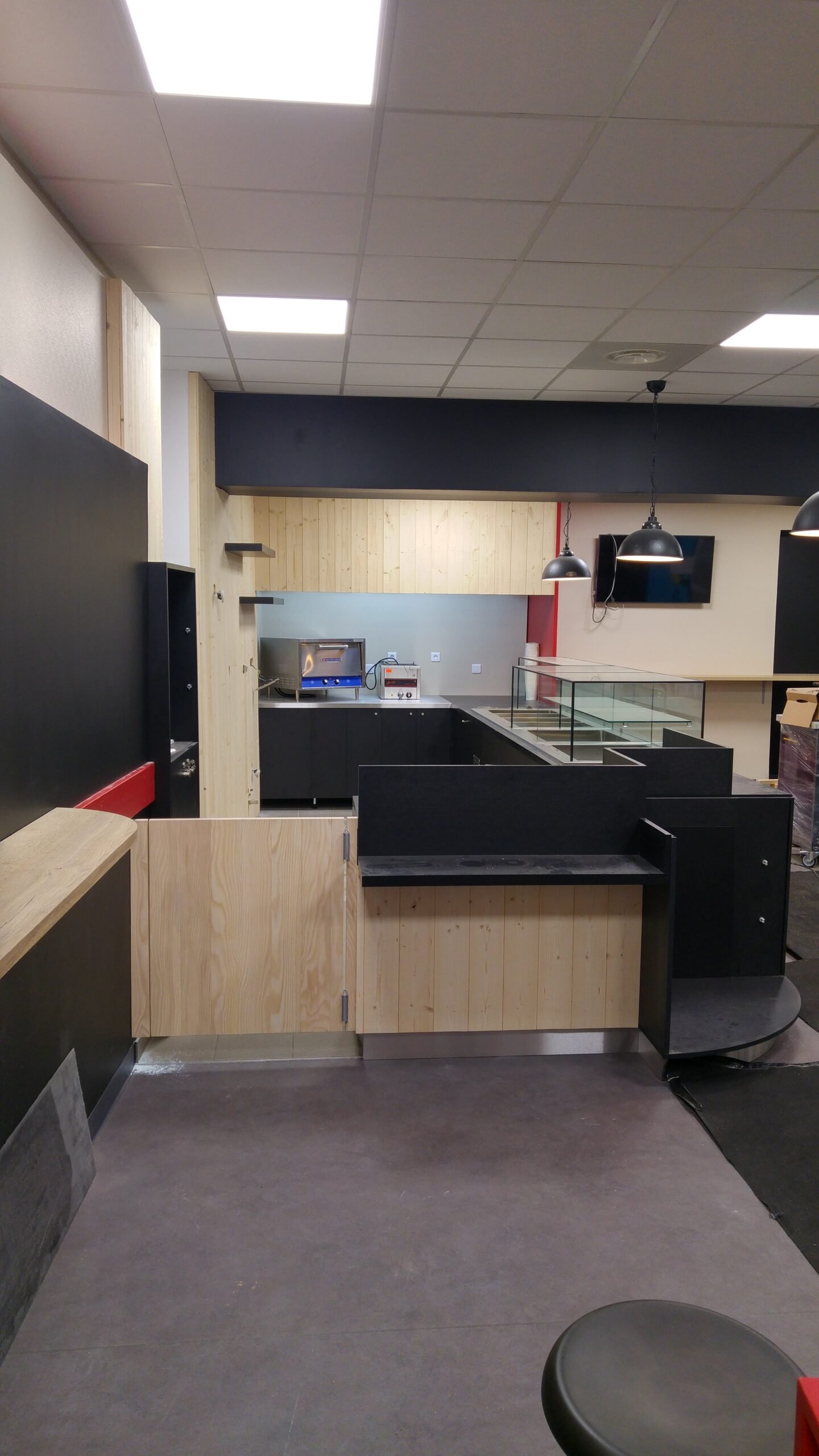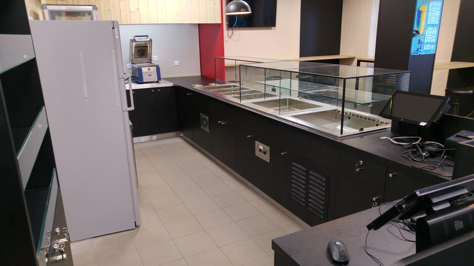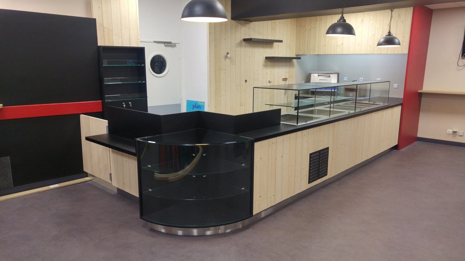 Aménagement de cafétéria avec comptoir en angle bois clair et noir, vitrine réfrigérée et espace d’encaissement vitré. Conçu pour allier esthétique, fonctionnalité et fluidité.