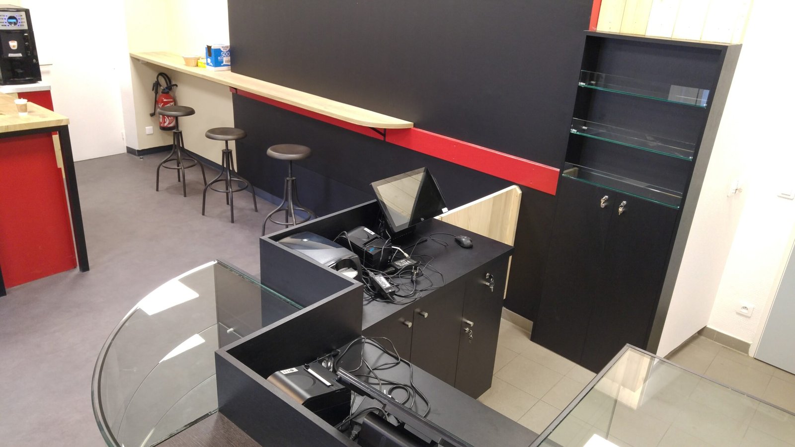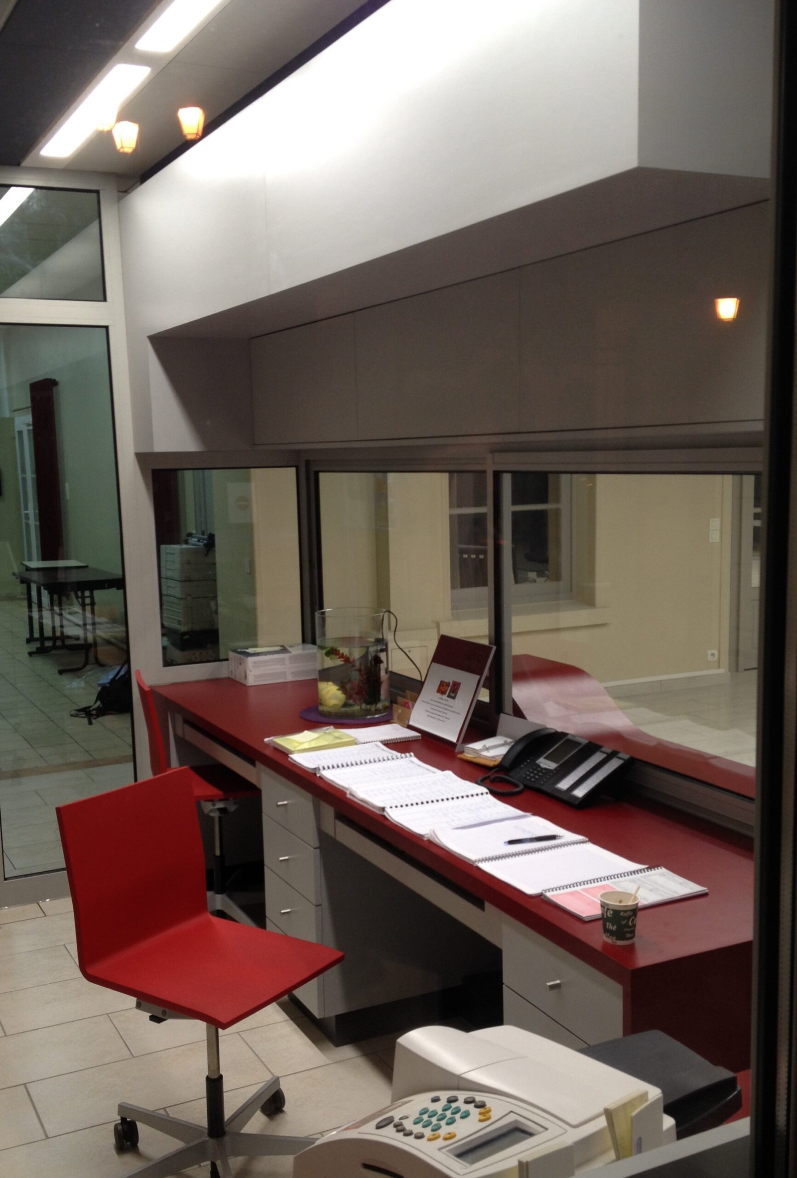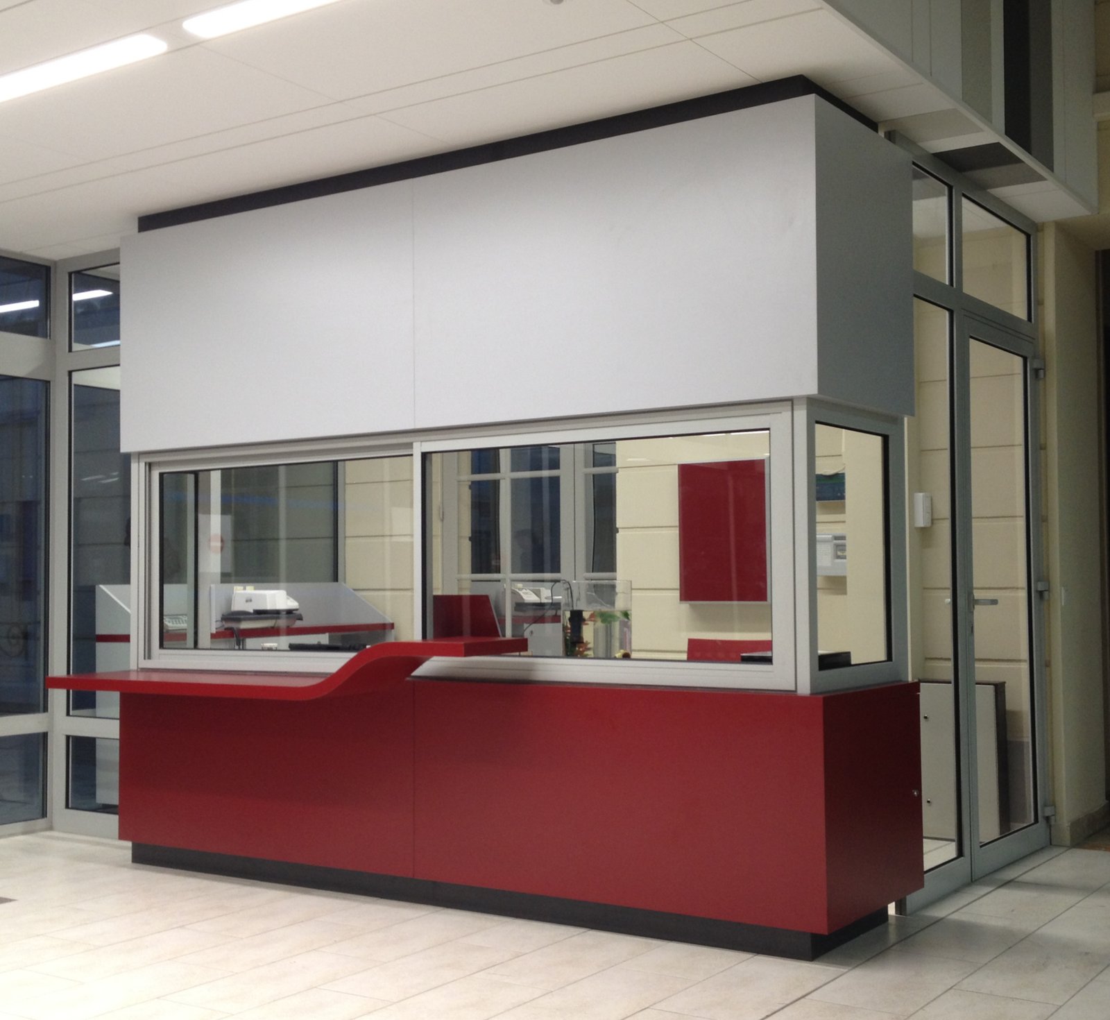 Guichet moderne avec comptoir rouge et éléments gris, intégrant une tablette courbée pour l’accueil. Design contemporain et épuré.