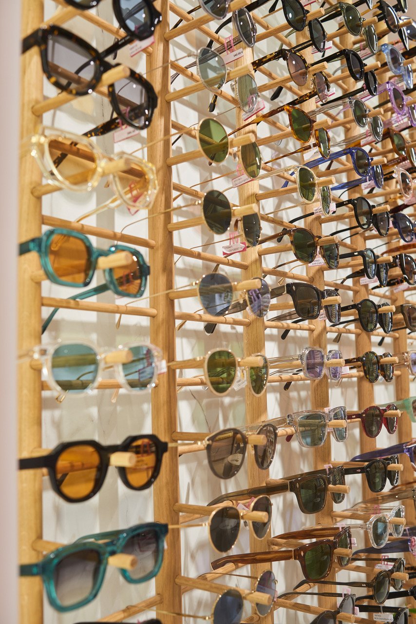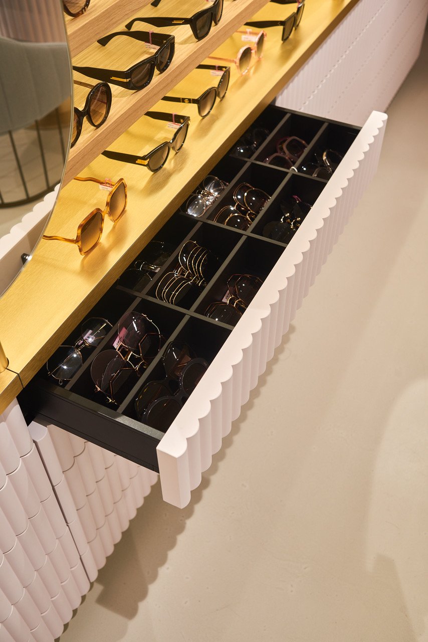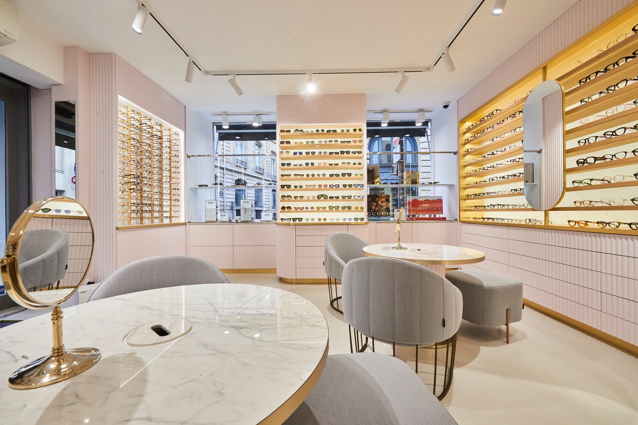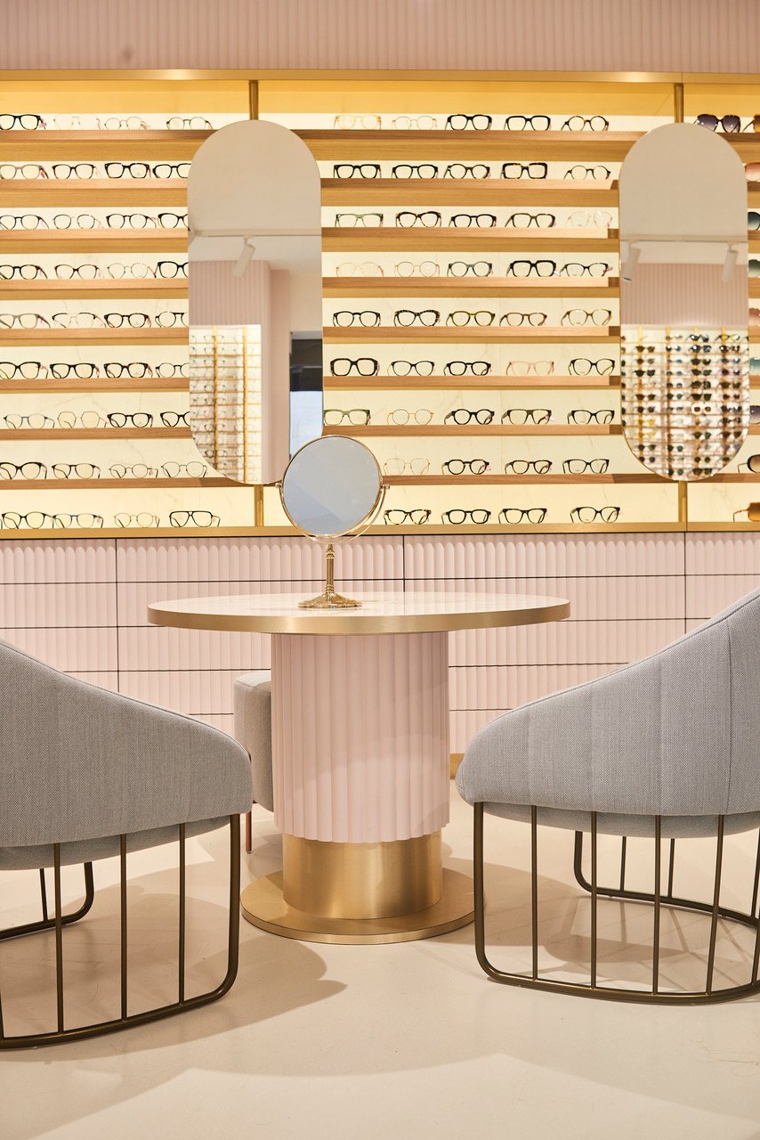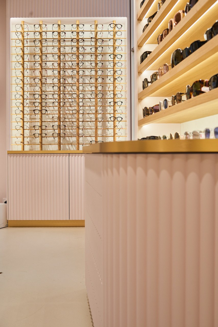 Aménagement raffiné d’une boutique d’optique aux tons pastel et touches dorées.