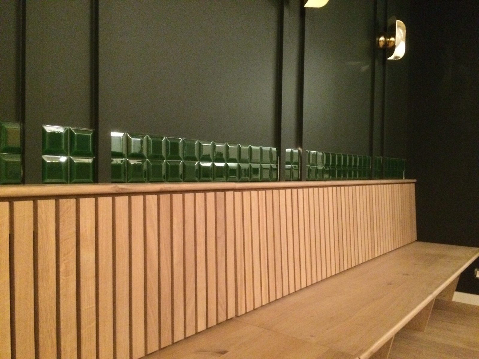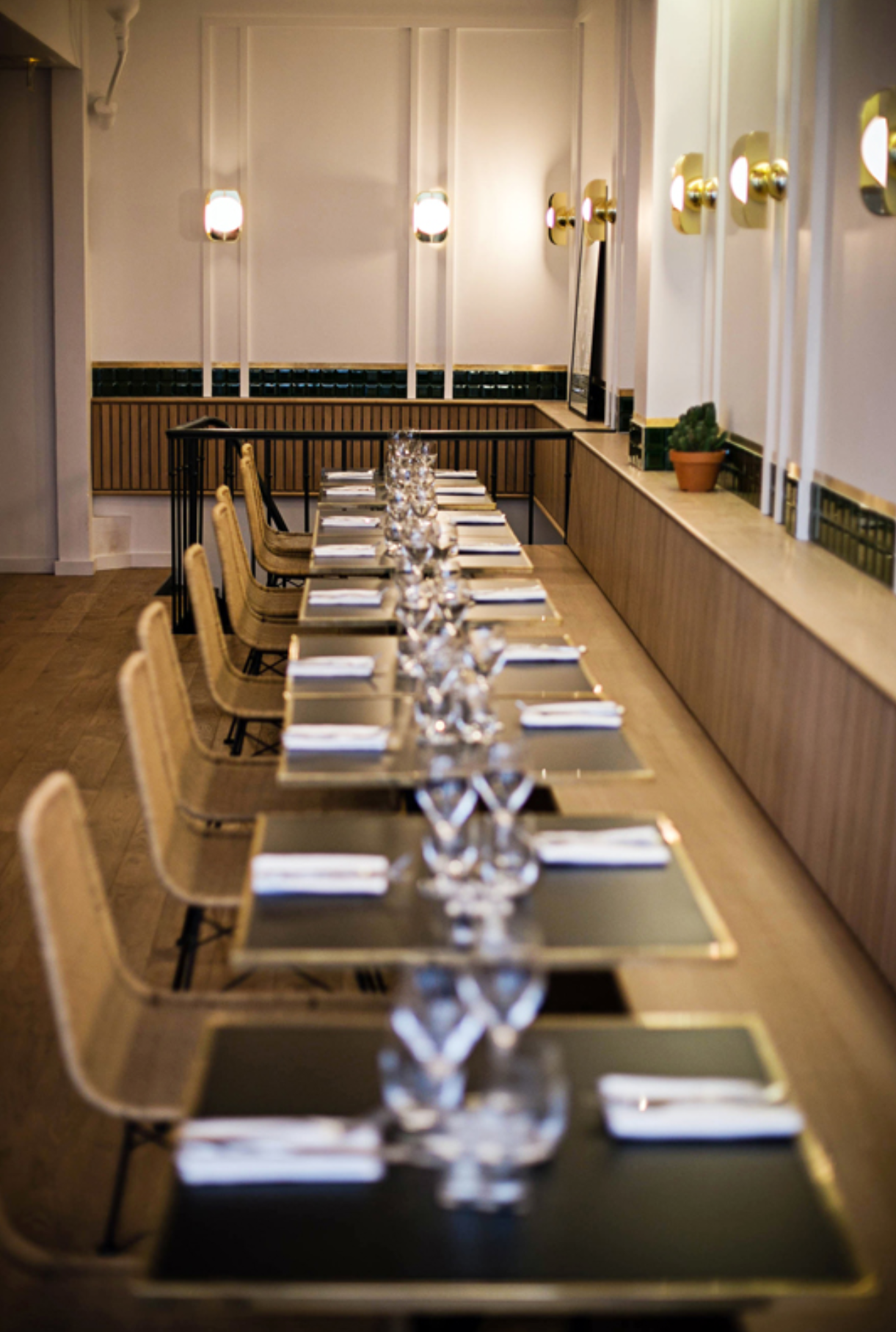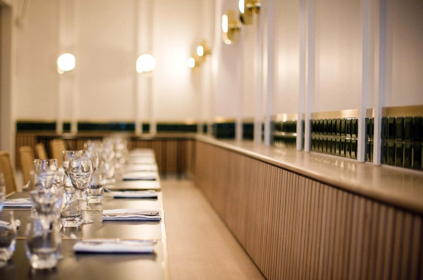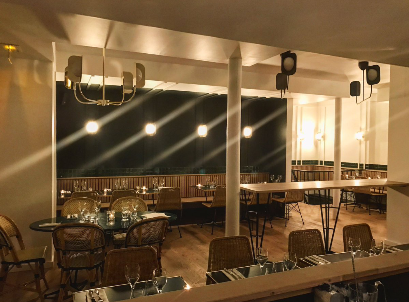 Aménagement raffiné d’un restaurant mêlant matériaux naturels, éclairages sophistiqués et banquettes en chêne pour une ambiance élégante et chaleureuse.