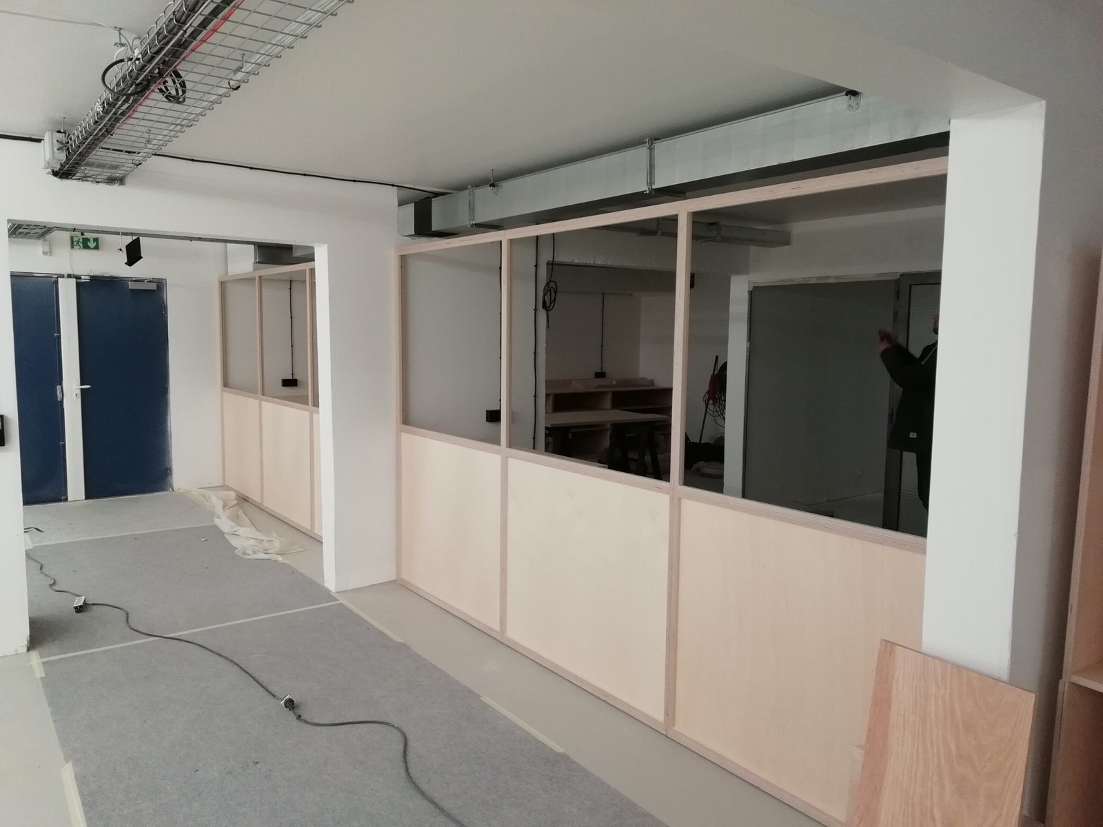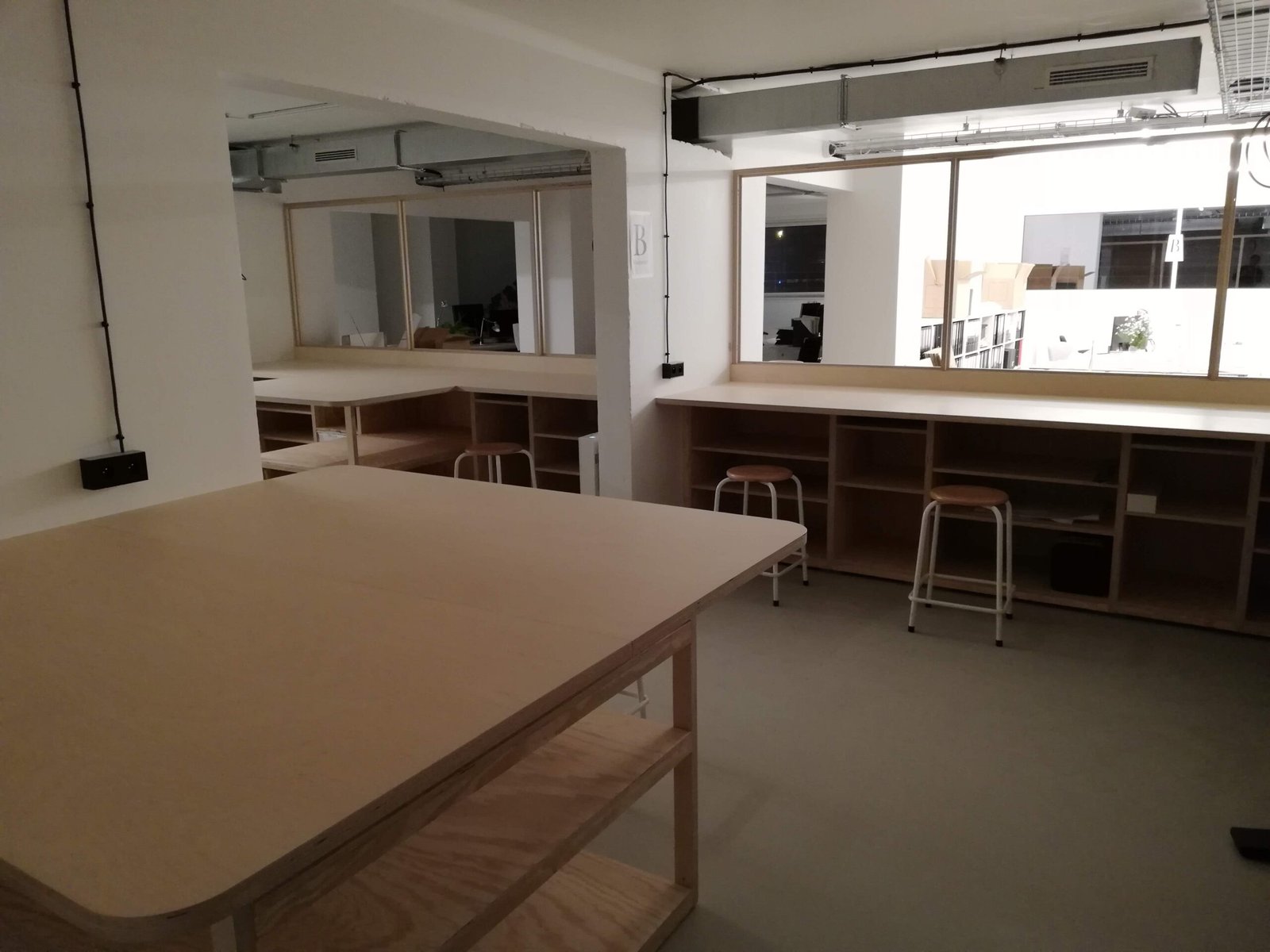 Aménagement sur-mesure pour un cabinet d’architecte avec meubles en bouleau et tebopin. Espaces de travail collaboratifs, rangements optimisés et cloisons vitrées.