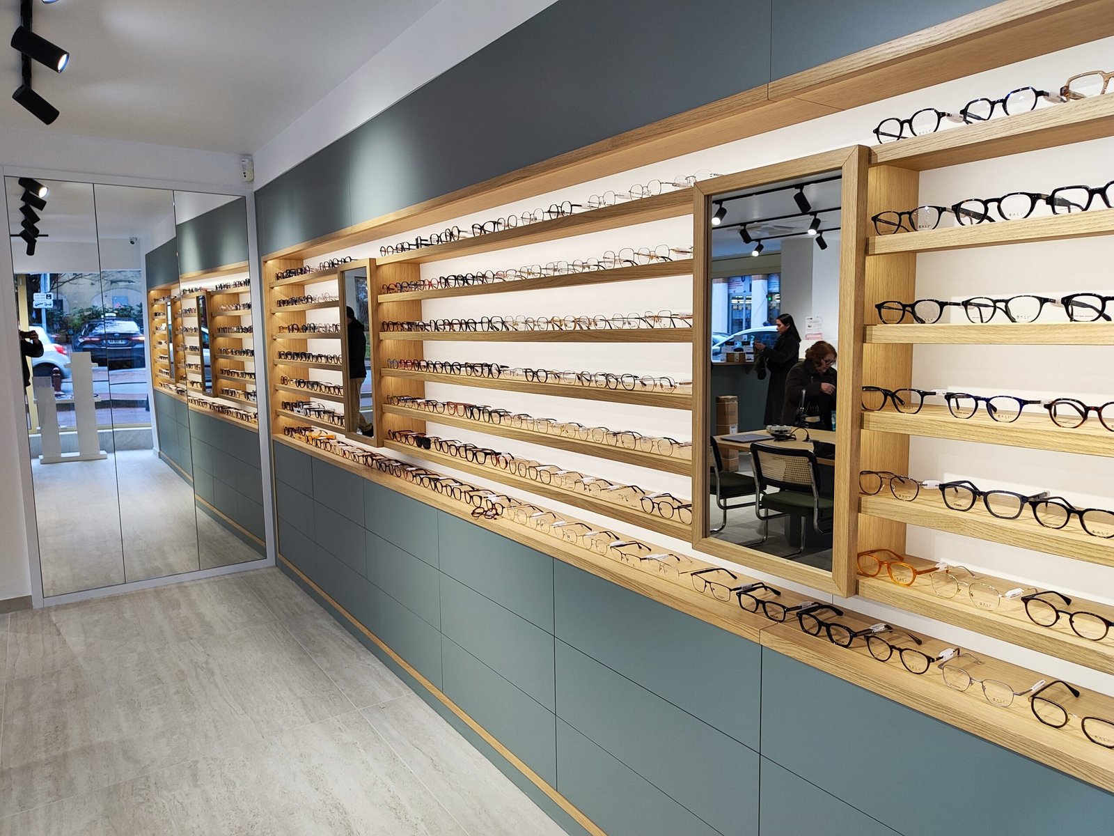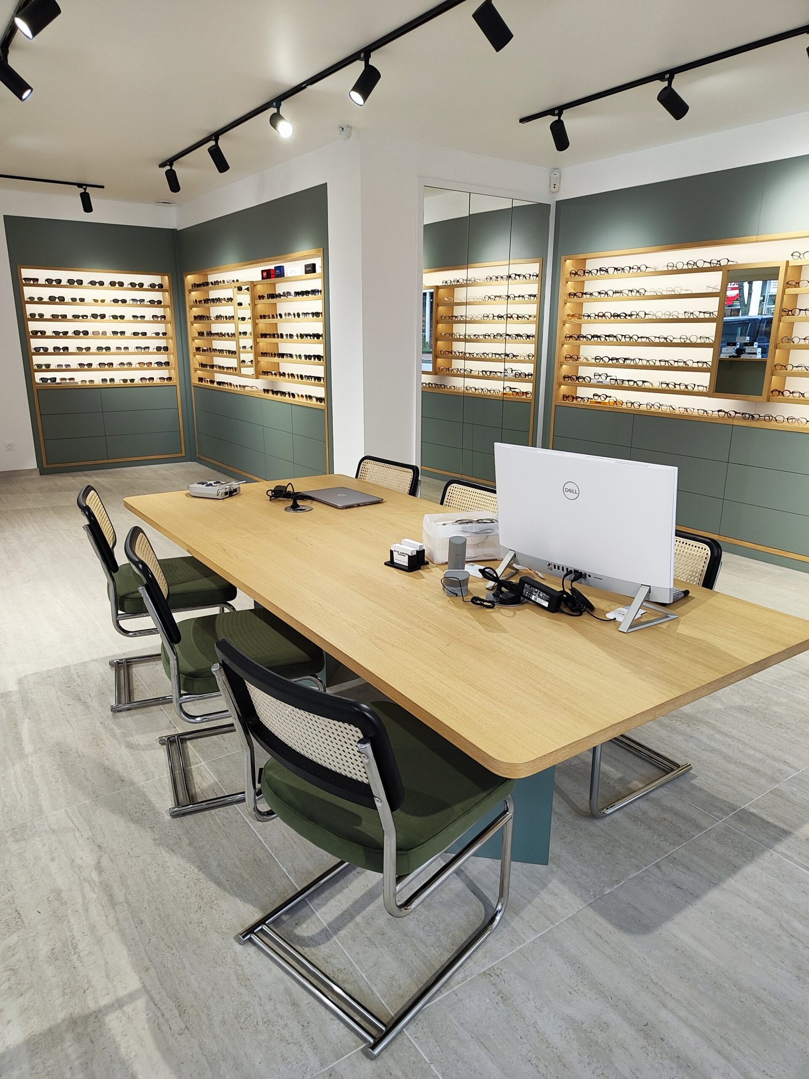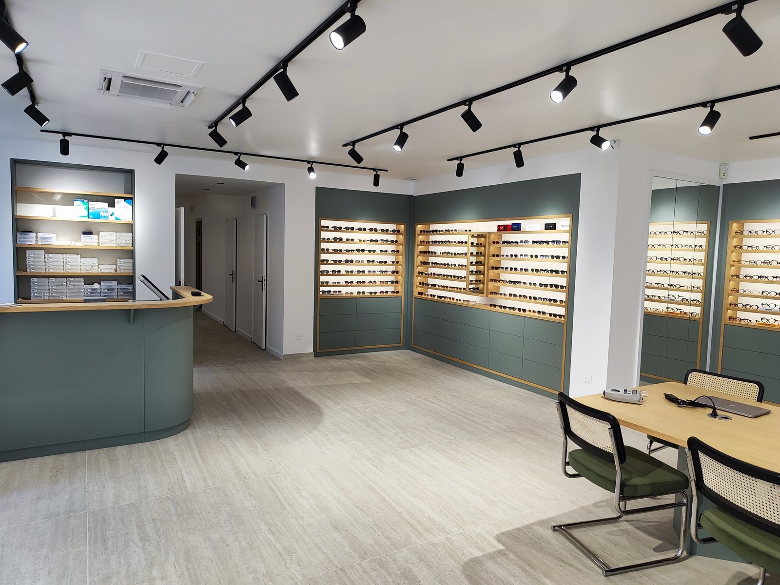 Aménagement sur-mesure d’un magasin d’optique avec mobilier en chêne clair et façades vertes mates. Présentoirs rétroéclairés et comptoir arrondi allient élégance et fonctionnalité.