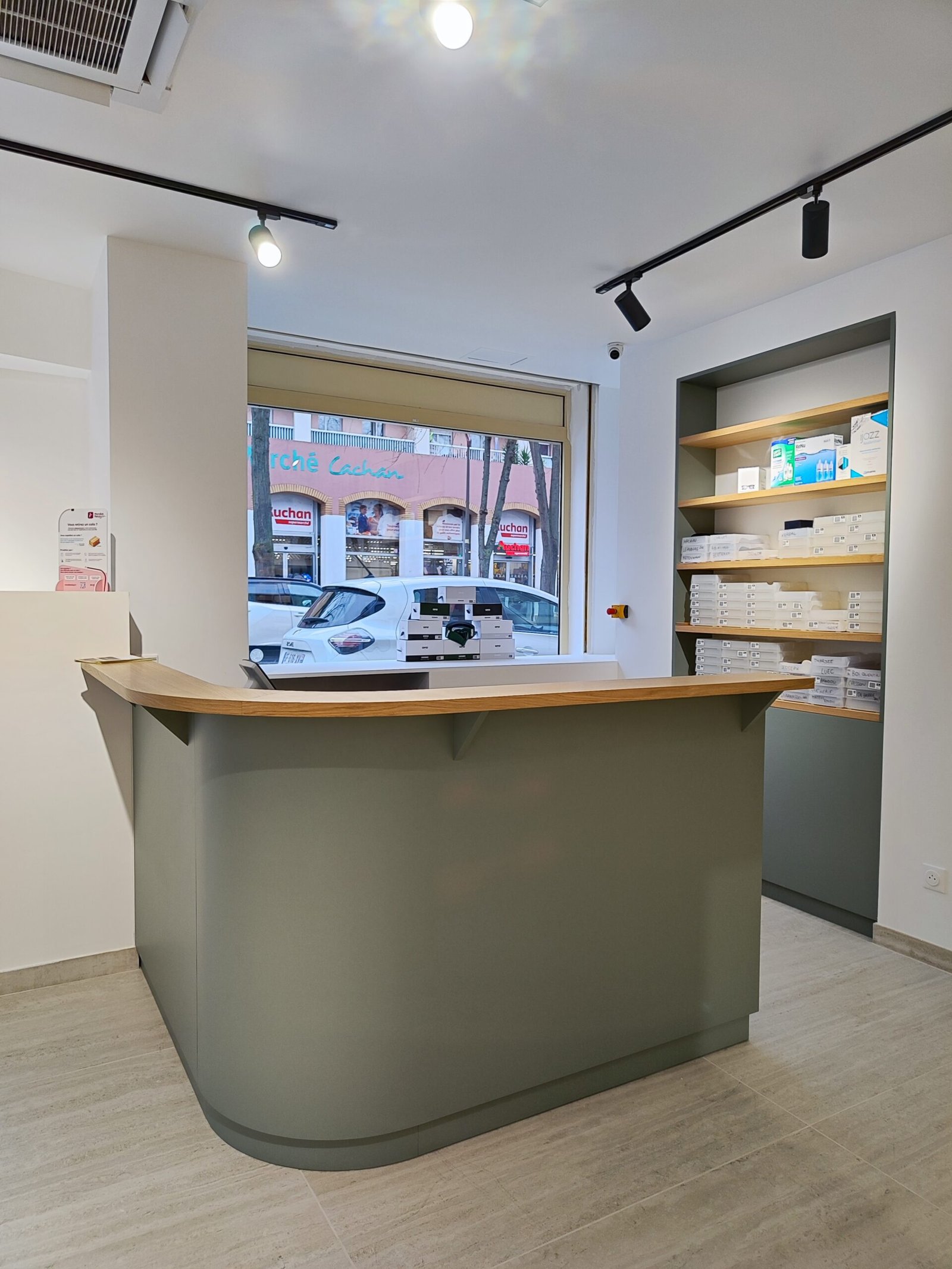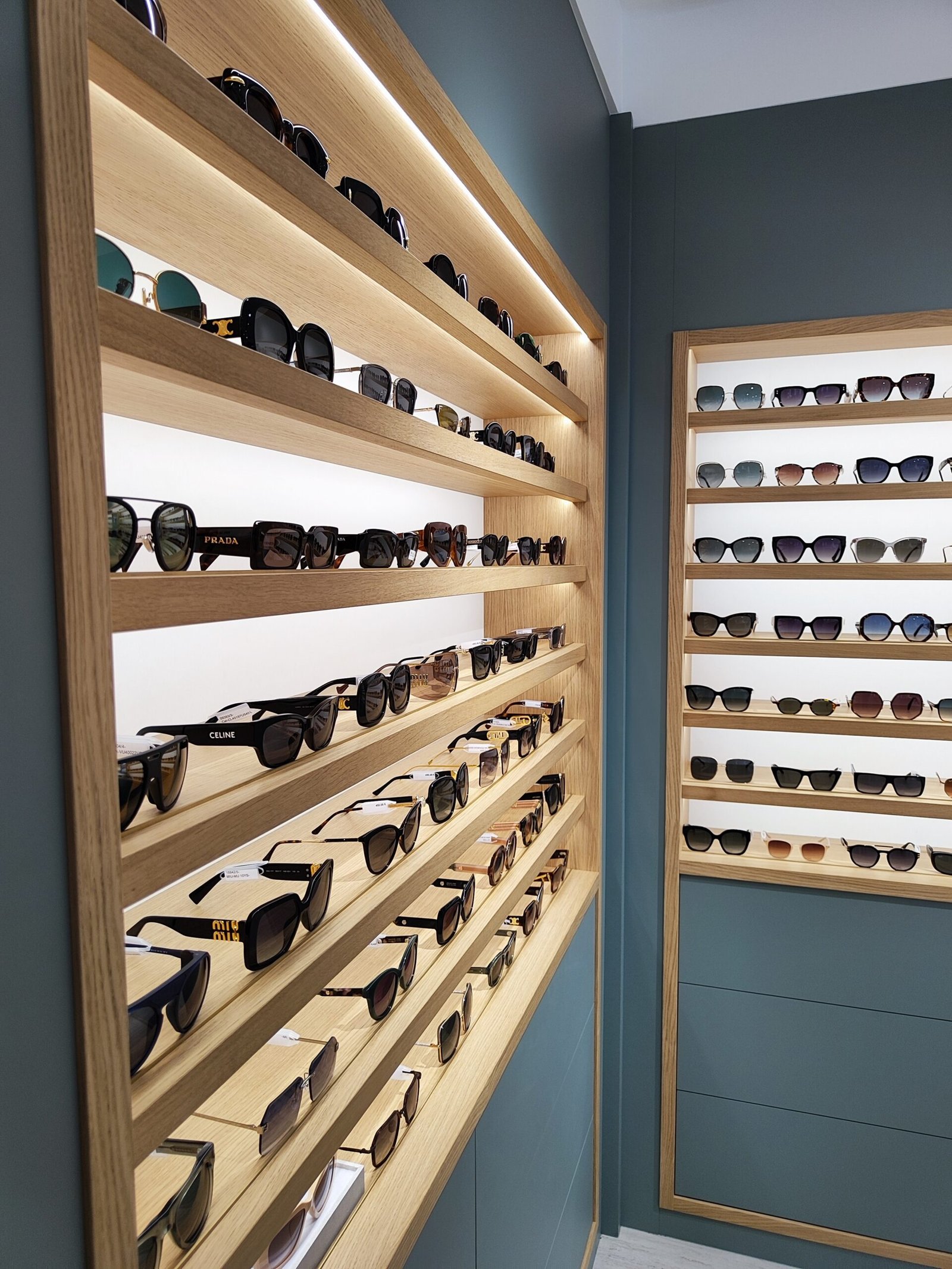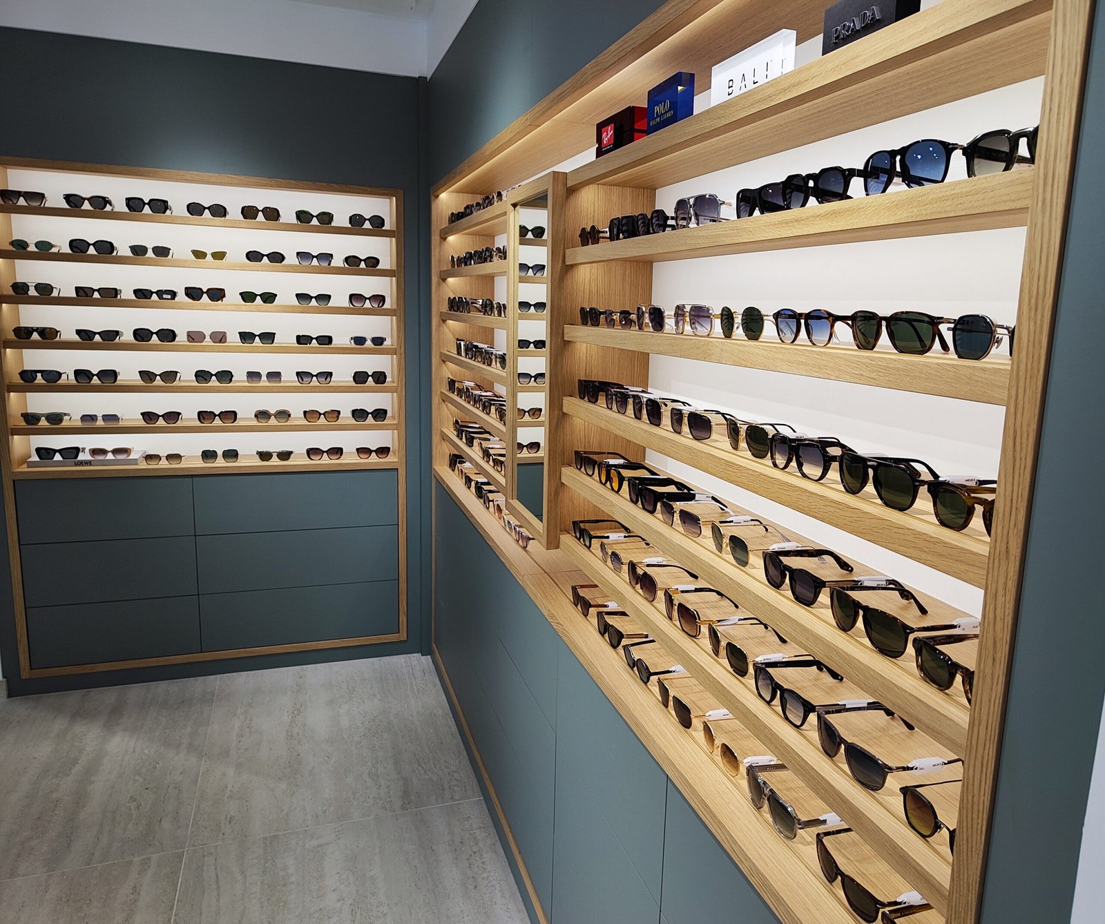 Aménagement sur-mesure d’un magasin d’optique avec mobilier en chêne clair et façades vertes mates. Présentoirs rétroéclairés et comptoir arrondi allient élégance et fonctionnalité.