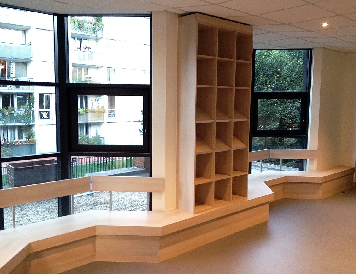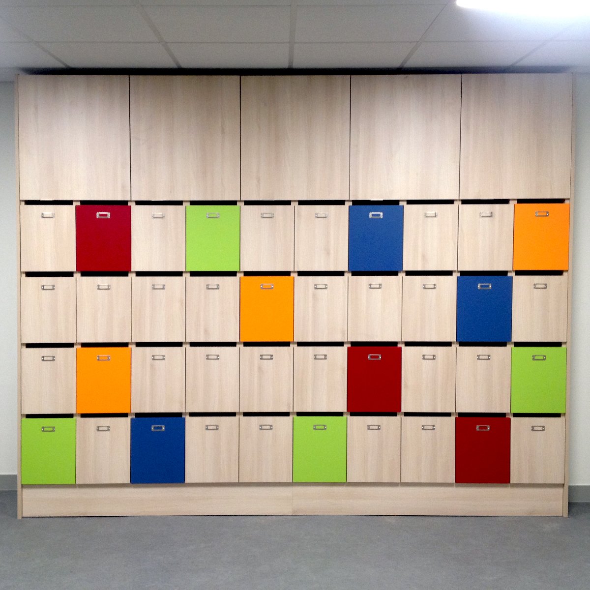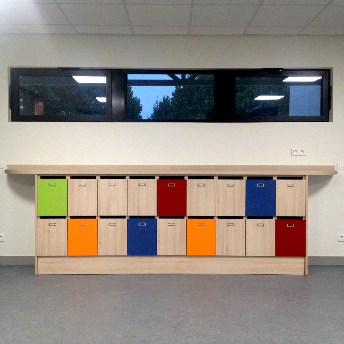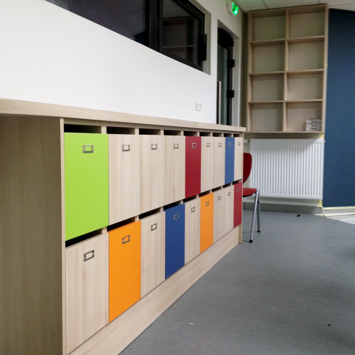 Mobilier en bois clair avec portes colorées, intégrant bibliothèque, casiers et bancs d’angle.